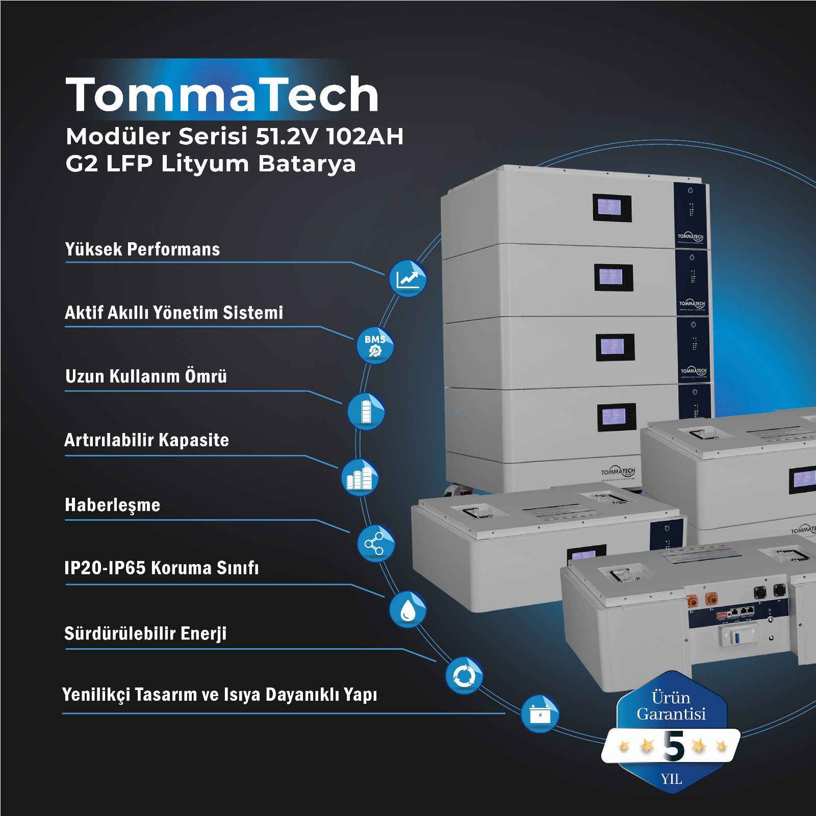 TommaTech Modüler Serisi 51.2V 102AH G2 LFP Lityum Batarya